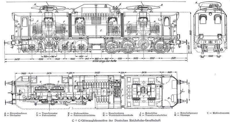 C'C'-gekuppelte Lokomotive mit "Winterthurer Schrägstangenantrieb" vor. 1922 ergingen Aufträge über zusammen 30 Maschinen (16 für das bayerische Netz und 14 für Schlesien). Der Auftragnehmer für die schlesischen Maschinen wurde die AEG, die sowohl für Mechan- und E-Teil verantwortlich war. Das Leistungsprogramm sah u.a. die Beförderung von 1.200-t-Güterzügen auf 10‰ Steigung mit 35 km/h und die Beförderung von 500-t-Personenzügen mit 45 km/h vor. Die Lokomotiven besaßen einen dreiteiligen Lokkasten mit Endführerständen. Die äußeren Kastensegmente waren mit dem Gestellrahmen fest verbunden; der mittlere Teil mit dem Brückenrahmen hingegen war drehbar auf beiden Triebgestellen gelagert. Die beiden äußeren Segmente beherbergten u.a. die Fahrmotoren; im Mittelteil (hier Innenansichten von vorn und hinten) war der Transformator angeordnet. Die Kastenteile waren mittels Faltenbälgen und Übertrittblechen verbunden. Das Laufwerk besaß zwei Triebdrehgestelle mit jeweils drei gekuppelten Radsätzen. Der Antrieb erfolgte durch je einen Doppelmotor, dessen Kraft über den Schrägstangenantrieb auf die stangengekuppelten Treibachsen übertragen wurde. Die Fahrmotoren waren fremdbelüftete, zehnpolige Wechselstrom-Reihenschlussmotoren mit Wendepolen. Der Hauptschalter war als Ölschalter, der Haupttransformator als Öltransformator in Mantelbauweise ausgeführt. Die Steuerung erfolgte über eine elektromagnetische Schützensteuerung mit 19 Dauerfahrstufen. Nach